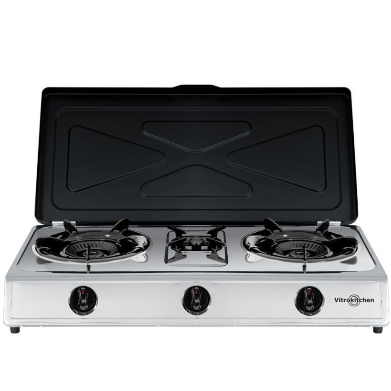 El hornillo de gas Vitrokitchen 360IB es una cocina portátil con tres fuegos de alto rendimiento. Su diseño robusto en acero inoxidable y su estructura compacta lo convierten en la elección perfecta para camping, terrazas o como cocina auxiliar.